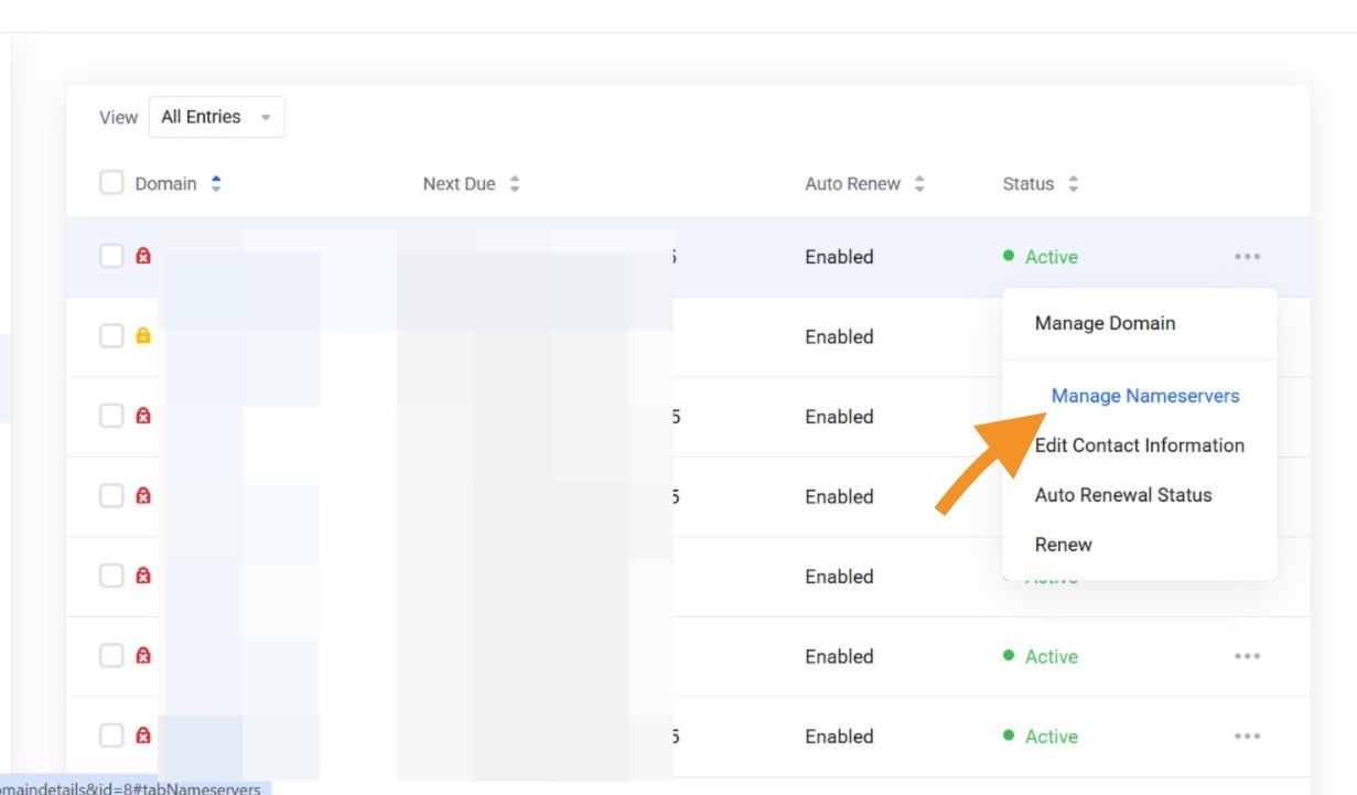 - Selanjutnya anda akan melihat domain yang anda miliki di radar hosting lalu klik titik tiga kanan anda kemudian klik “manage nameserver”.